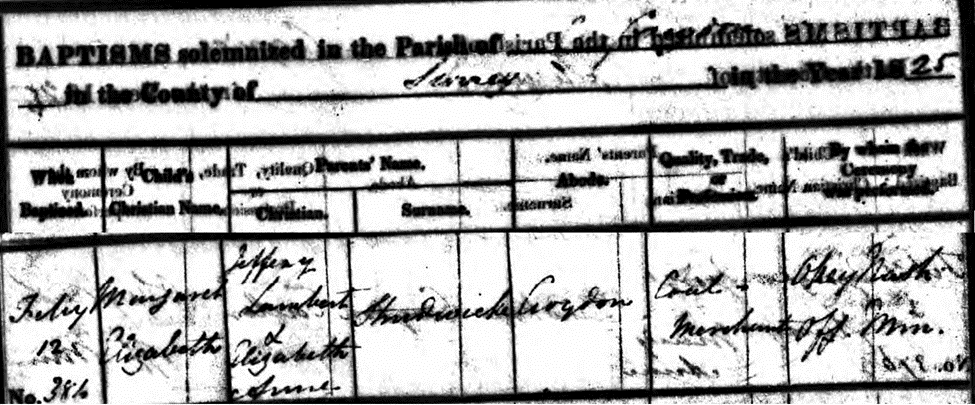 By contrast to Frederick La Cloche Nicolle’s ancestry on the Isle of Jersey, Margaret Elizabeth Strudwicke’s roots were in England in the County of Surrey in South London. Margaret was baptized on February 12, 1825 at Saint John the Baptist Church in the town of Croydon. No birth record has been found so we only know she was born some weeks or months before February 12 in 1824 or 1825. As mentioned above, her father was Jeffrey Lambert Strudwicke and her mother was Elizabeth Anne (Hayes) Strudwicke. On Margaret’s baptism record, her father Jeffrey is described as a coal merchant. On several other family records including the marriage certificate of his son John Hayes Strudwicke, shown above, he is designated with the rank of Gentleman. This was the lowest rank of the landed gentry of England. Historically, the gentry was a British social class of landowners who could support themselves from their land and other independent means. All told, Jeffrey and Elizabeth had four children; one daughter, Margaret Elizabeth, and three younger sons, John Hayes, Montague Johnson, and Henry William.