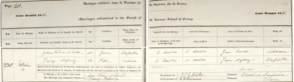 Proof was needed to verify that Elizabeth Touzel was indeed the first wife of the Jean Nicolle whose second wife was Esther Landhatherland. This in turn would show that this Jean Nicolle was the father of Frederick La Cloche Nicolle. A breakthrough discovery came involving the signature of Frederick La Cloche Nicolle who served as a witness at two separate weddings.