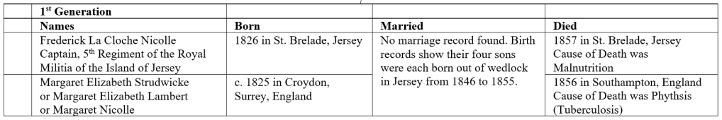 The Jersey birth records for these three sons and a fourth son Arthur Ernest who was born and died in 1855 list Margaret as their mother and describe that three were born in St. Brelade, possibly at Margaret’s home, and Francis was born in the hospital at St. Helier. Birth information received from the Superintendent Registrar at St. Helier, Jersey along with baptism records obtained from the Jersey Heritage archive, clearly show that Margaret Elizabeth Strudwicke (sometimes Lambert) is the mother of these four sons Frederick Nicolle, Percy Alfred, Francis, and Arthur Ernest.