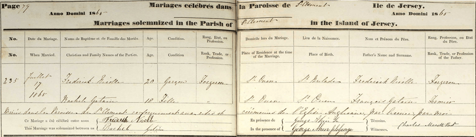 These separate 1851 Channel Islands census records for Frederick and Margaret show that while they were not living together, they both lived in Vingtaine du Coin Varin, one of five vingtaines in the Parish of St. Peter. As described earlier, the French term vingtaine refers to a subdivision of about twenty households so their families certainly would have been neighbors. As related above, Frederick served as a witness for the wedding of Margaret’s eldest brother, John Hayes Strudwicke. Margaret was the second witness and signed her name as Margaret Nicolle. So, although Frederick and Margaret had three sons at this point, each recorded as born out of wedlock, it is possible that they did marry. Another fact to support this possibility is that each of their three sons who lived to adulthood were using the surname Nicolle as teenagers.