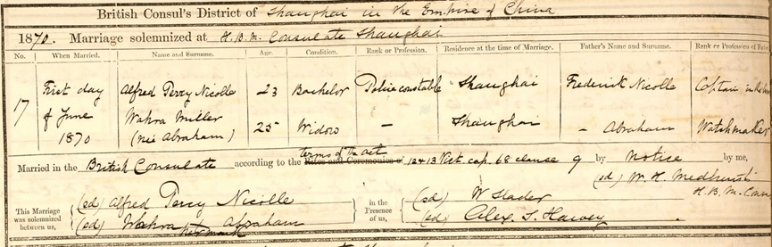 Below are two graphics describing Alfred’s father. The Shanghai record for his first marriage describes his father as Frederick Nicolle who is a Captain in the Army. The newspaper announcement for his second marriage details that he is the second son of Frederick La Cloche Nicolle of Le Coin House in St. Brelade’s, Jersey.