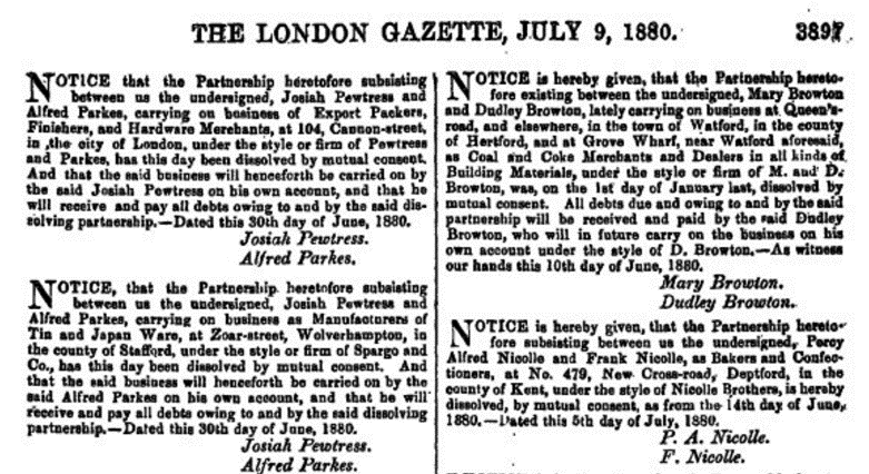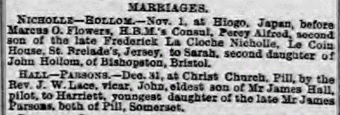 The third brother, Francis (Frank) settled closer to Jersey in England and became a baker. Frank married Emma Huddlestone in 1872. Emma’s father, Charles Huddlestone also was a baker. A newspaper article from 1879 details that brothers Alfred and Frank had a joint business venture called Nicolle Brothers Bakery that was being dissolved. Alfred had returned from Japan to England briefly at this time.