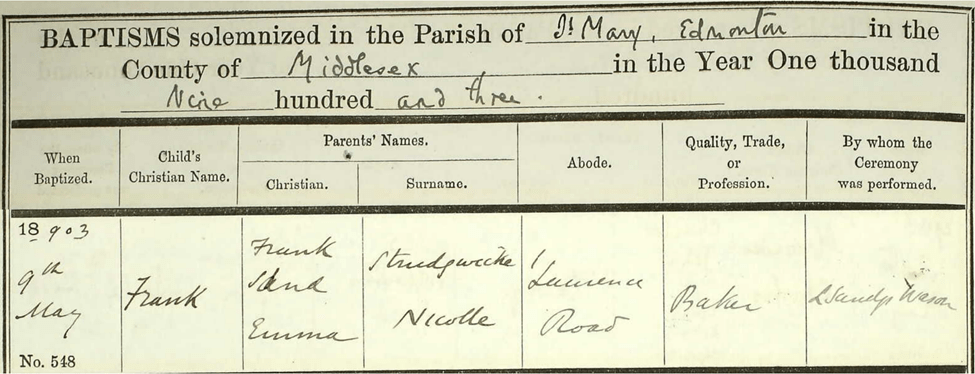 There is a curious question regarding Frank’s change of surname. After being born Francis Lambert, he then used the name Francis (Frank) Nicolle as a teenager and into adulthood. At some point, Frank Nicolle transitioned to being referred to as Frank Strudwicke. The record below details the birth of Frank and Emma’s youngest child, a son, Frank Strudwicke. Note that the father’s name is Frank Strudwicke and the mother’s name is Emma Nicolle. So, in 1903, Frank had changed his name to Strudwicke while his wife, Emma, had retained her married name of Nicolle. Actually, Frank’s name change may have happened earlier as only his eldest child Louisa Margaret was born with the surname Nicolle. The five later children were named Strudwicke at birth and Louisa Margaret eventually changed her name to Strudwicke as well. By comparing birth, marriage, and census records, Frank’s name change happened in the early 1880’s.