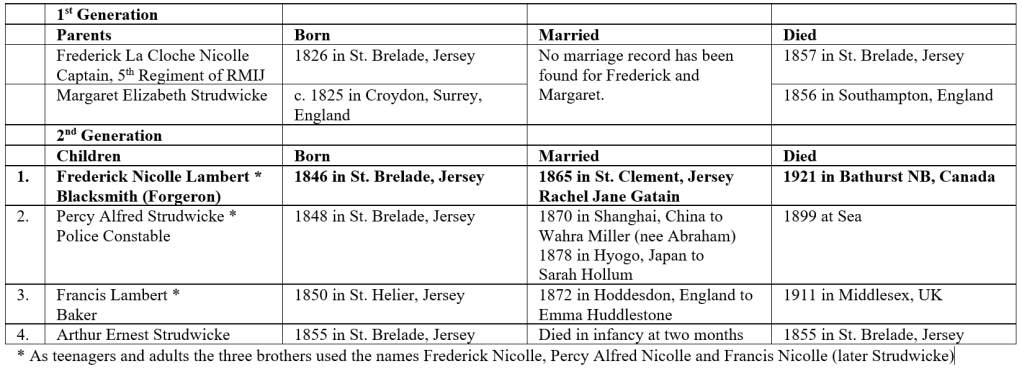 Each of the three brothers married and raised a number of children. So, by the late 19th Century Frederick La Cloche Nicolle and Margaret Elizabeth Strudwicke had nineteen grandchildren born in various locations including Jersey, Quebec, Japan, and England. All are shown in the table below. Multiplying for subsequent generations, Frederick and Margaret would have several hundred descendants today.