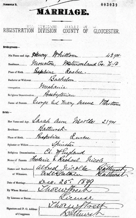 The first of the sisters to marry was Sarah who married Henry Whittom on Christmas Day, 1899. Witnesses at their marriage in Bathurst were Alfred Nicolle, Sarah’s brother, and A.S. Gatain who was likely Rachel’s nephew, Arthur Stanley Gatain. This would confirm that members of Rachel’s side of the family (Gatain) resided in Bathurst as well. In fact, the Gatain’s appear to have been established in Bathurst before the Nicolle’s arrived. Also, Henry Whittom’s younger sister, Emma, was the wife of Frank Nicolle. This is not surprising as the Whittom’s and the Nicolle’s were life-long friends growing up together in Paspébiac. The following year 1900, tragedy struck the family again when Sarah’s husband, Henry, died of pneumonia after just five months of marriage. The 1901 Canada census finds Frederick and Rachel living with their three daughters Sarah, Alinda, and Lydia in Bathurst with the oldest, Sarah, now age 21, described as a widow.