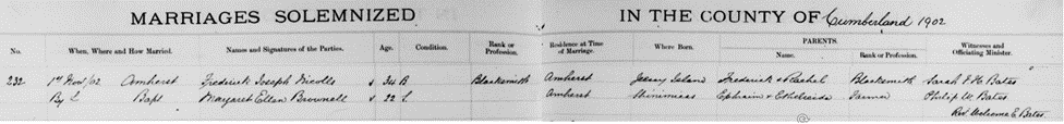 Our story continues with the next generation and Frederick and Rachel’s eldest child, Frederick John, my great grandfather, who was born in 1866 in Jersey and then immigrated with his family to Canada shortly thereafter. As described above, he appears in in the 1881 Canada census at age 15 working as a blacksmith and living with his parents, two brothers, and a sister in Paspébiac, Quebec. Ten years later, he is not listed with the family on the 1891 census in Percé QC and presumably living on his own. In 1902, Frederick John Nicolle married Margaret Ellen Brownell in Amherst, Nova Scotia. Margaret Ellen was the daughter of Ephraim Dixon Brownell, a farmer, and Authalinda Eliza Jane (Reid) Brownell from Shinimicas, Cumberland County about twenty miles east of Amherst. The Brownell and Reid families lived for several generations in the area of Shinimicas and Northport NS and nearby New Brunswick. Both families emigrated from New England around the time of the American Revolution. In the marriage documentation below, Frederick John’s middle name is incorrectly recorded as Joseph.