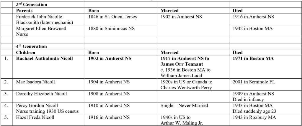 Between 1924 and 1926, Margaret Ellen (Brownell) Nicolle oversaw the family’s exodus from Amherst, Nova Scotia. This included herself, her four surviving children, Rachel Authalinda, Mae Isadora, Percy Gordon, and Hazel Freda along with Rachel’s husband James Orr Tennant and their two children Frederick Ferguson and Margaret Isabelle who was born in Amherst in 1926. The entire family immigrated to the United States settling in Boston, Massachusetts.