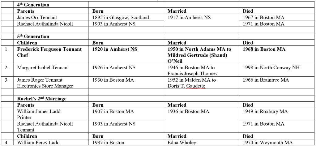 Frederick Ferguson Tennant, my father, eldest child of James Orr Tennant and Rachel Authalinda Nicolle, was born in Amherst, Nova Scotia in 1920. After his family immigrated to Boston in 1926, he grew up in Roxbury MA. In 1935, he graduated from the Dwight School in Boston. In 1941, he is described on his US World War II Draft Card for Young Men as a farmer residing in North Abington MA at 363 Lincoln St, the home of his grandmother, Margaret Ellen Nicolle. Still a Canadian citizen, he returned to Canada during World War II and worked as a C.N.R. Constable for the Canadian National Railways. In the late 1940’s, Frederick met Mildred (Shand) O’Neil in western Massachusetts. Mildred and her sisters had immigrated to Pittsfield MA in 1926 the same year that Frederick and his family immigrated to Boston. Coincidentally, Frederick and Mildred were both born in Amherst, Nova Scotia and their families left there in the same year, 1926, perhaps due to the employment crisis and economic conditions described above. In 1950, Frederick and Mildred were married and settled in North Adams MA where they had one son, Raymond Frederick Tennant. In 1959, Frederick became a naturalized U.S. citizen. Later in life, he worked as a professional chef at various institutions around New England including Pine Manor Junior College (no longer located in Wellesley)Pine Manor Junior College in Wellesley MA and Morgan Memorial Goodwill Industries in Boston. He died in 1968.